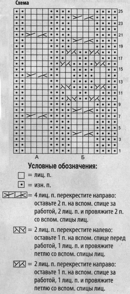 Кокетка: передняя часть — наберите на спицы №3,5 27 п.+ 2 кром. п. Далее вяжите резинку 3×3, когда провяжете 18 рядов, добавьте 26 п. Далее вяжите косы спицами №4 по схеме, начиная с лиц. ряда: 2 изн. п., 4 лиц. п., 4 изн. п., 4 лиц. п. и т. д. Таким образом провяжите 220 рядов (узор косы Б должен повториться 10 раз), затем убавьте 26 петель и вяжите резинку 3×3 спицами №3,5 18 рядов. Петли закройте. Задняя часть — наберите на спицы №3,5 27 п.+2 кром. п. Далее вяжите резинку 3×3, когда провяжете 18 рядов, добавьте 26 петель. Далее вяжите спицами №4 лиц. гладью 220 рядов, затем убавьте 26 петель и вяжите спицами №3,5 резинку 3×3 18 рядов.